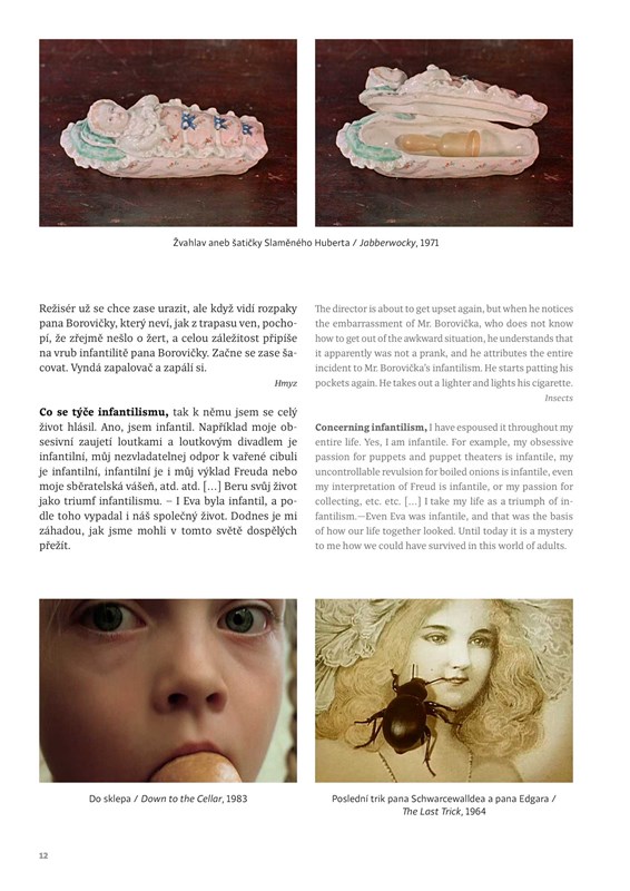 This narrative publication maps the creative principles of worldrenowned surrealist Jan Švankmajer. Bruno Solařík, the author of the book, takes part in the activities of a group of surrealists with the artist and director, and presents, by means of Švankmajer’s opinions and creations, a complete testimony of the exceptional work of this world legend of Czech cinematography. One component of the publication is the never before published reproductions of Švankmajer’s objectsfetishes and exclusive shots from his newest film Insects.