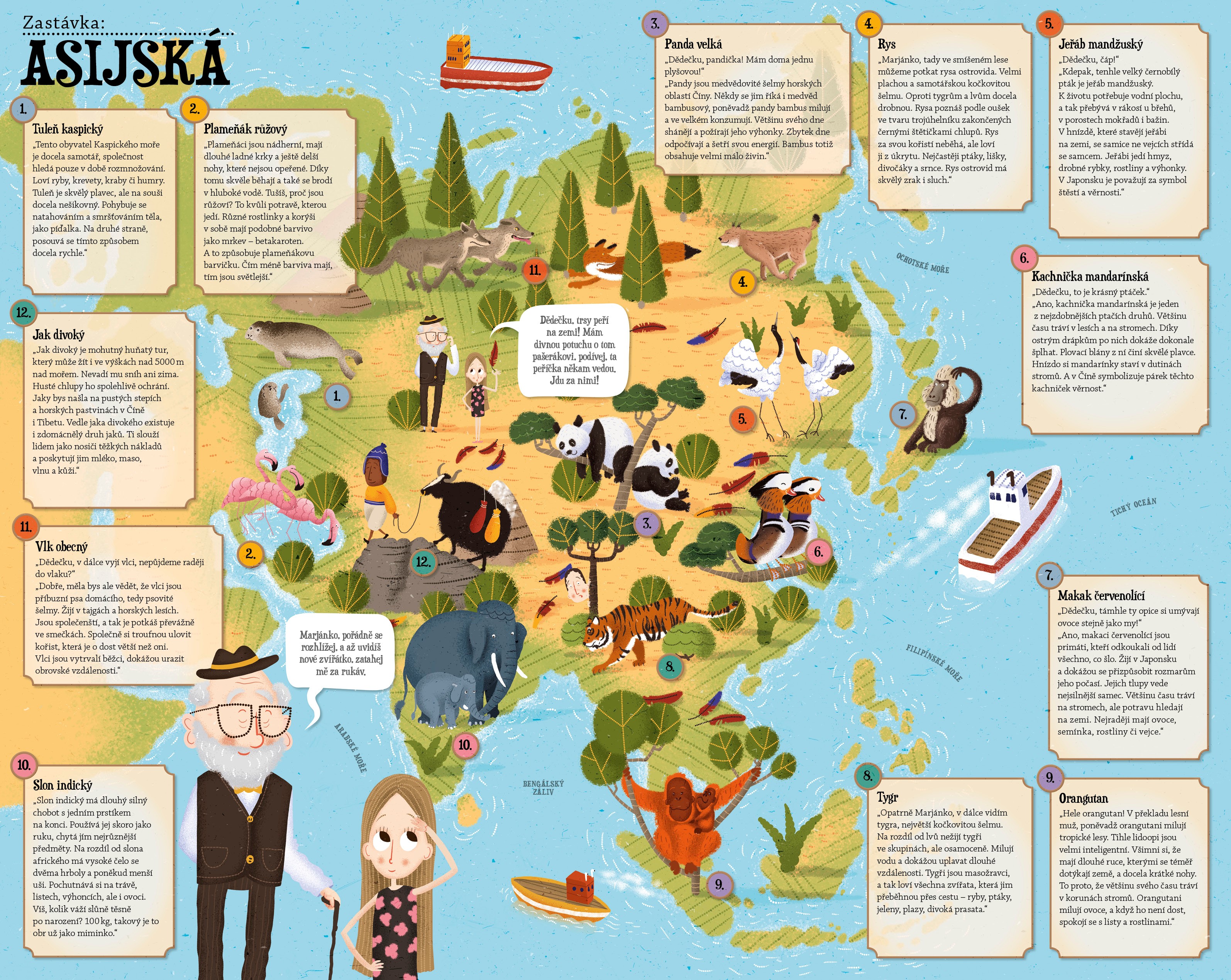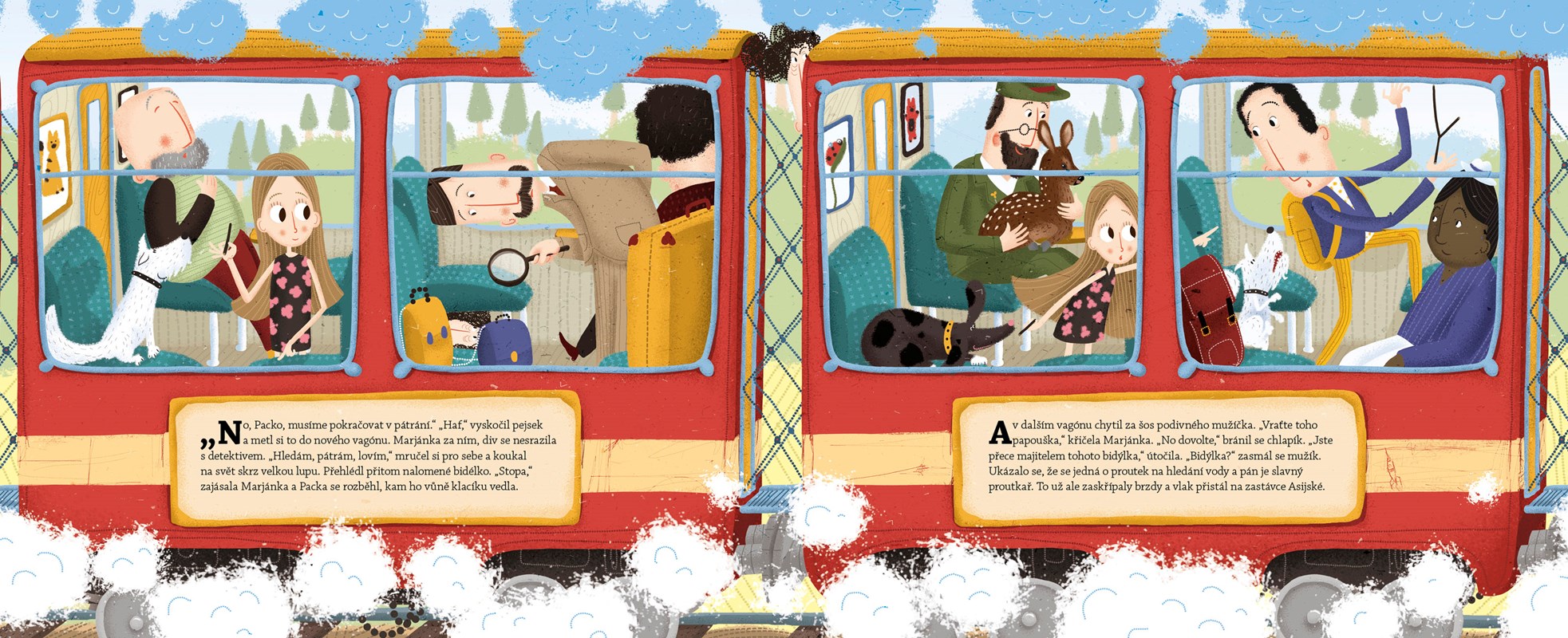 Není nad to, když tě vezme dědeček na cestu kolem světa – za zvířátky. Tak jako holčičku Marjánku. Stačí nasednout do vlaku a výlet, na kterém poznáš žirafy, opice, tygry, tučňáky, štíry, zebry, lední medvědy, soby, žraloky i delfíny, může začít. A co teprve, když zjistíš, že je ve vlaku pašerák a pašuje vzácného papouška. Hned se můžeš přidat k detektivovi a spolu s ním po tom zlosynovi pátrat. Přesně to udělala Marjánka a že bylo to pátrání pěkně dobrodružné! Stejně jako zastávky na všech kontinentech světa. Jestli chceš, přidej se na cestu, nauč se zajímavé živočichy a měj oči na stopkách. Ať ti ten pašerák neproklouzne pod nosem.