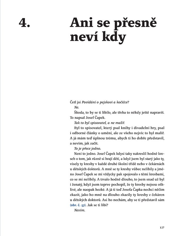 Průvodce světem výtvarného umění pro malé i velké. Kniha je určena těm, kteří si chtějí s dětmi povídat o výtvarném umění. Naučit je dívat se na obrazy a sochy bezprostředně, bez přehnaného respektu i strachu z neporozumění. Aby si z každého setkání s výtvarným dílem dítě odneslo to, co si odnést může a dovede. Není důležité, aby hned vědělo, kdo a kdy daný obraz namaloval, je důležité, aby vědělo, proč je třeba zvláštně rozmazaný. Kniha je průpravou ke zdravému vztahu k umění.