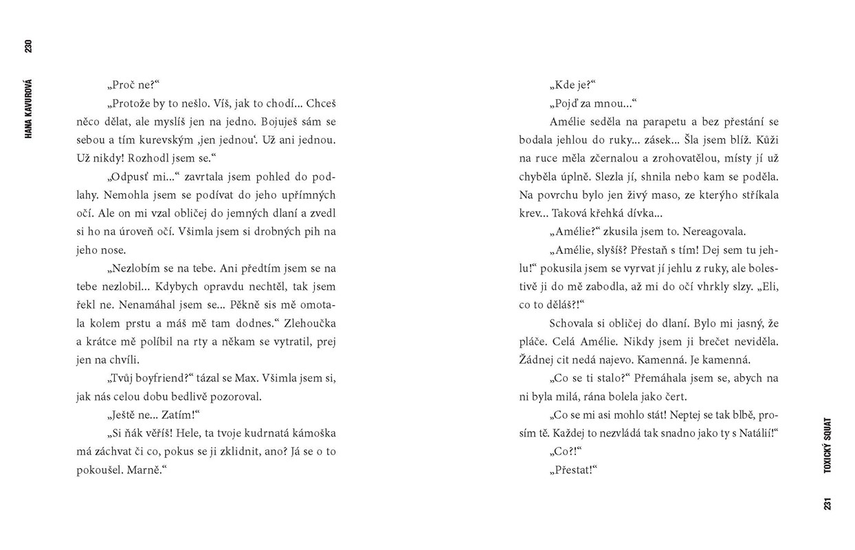 Syrově upřímná exkurze do ponurého světa tvrdých drog. Toxický squat od mladé autorky Hany Kavurové oslovuje širokou škálu čtenářů napříč generacemi. Kniha se výpovědní silou i autenticitou příběhu dvou sester v područí omamných látek může směle řadit po bok klasických bestsellerů tohoto žánru, jakými jsou třeba My děti ze stanice ZOO či Memento. "Snažím se vrátit do normálního života a chovat se jakoby nic. Mluvím s lidma a přemýšlím, jak se k nim zase dostat o krok blíž. Ale moc se mi nedaří... Nechápu je. Ignoruju jejich problémy, se kterými se mi svěřujou. A občas si říkám, o čem to vůbec melou. Copak vědí něco o životě?! A potom si vzpomenu, co a jak jsem řešila já. Fety fetem. Fetem fety... Jinak snad vůbec nic. Den co den. Roky... "