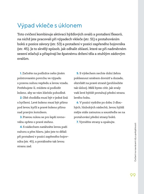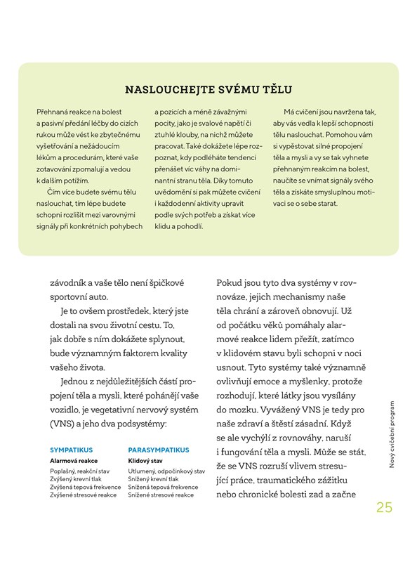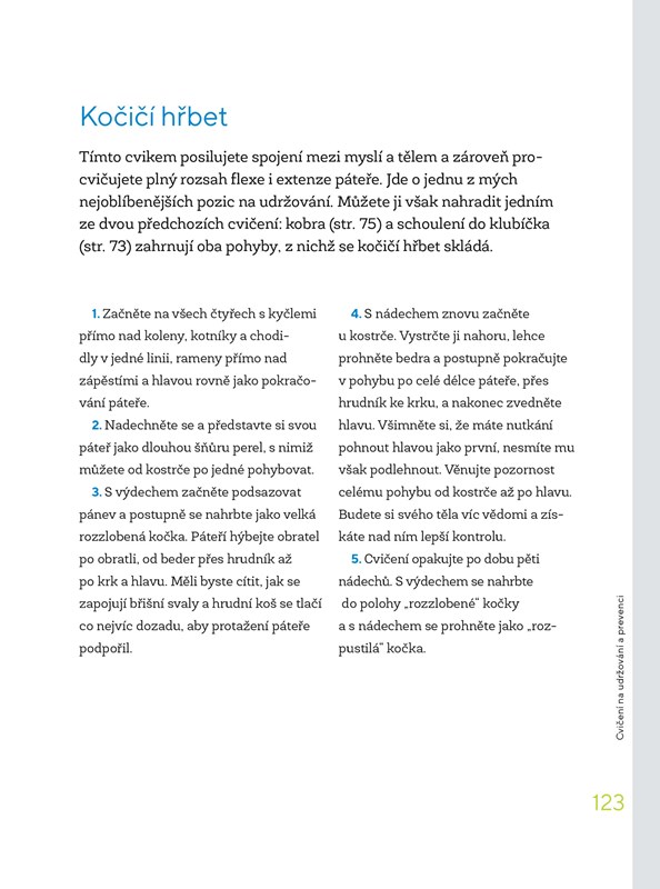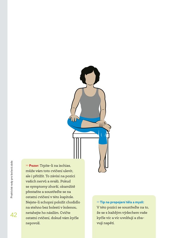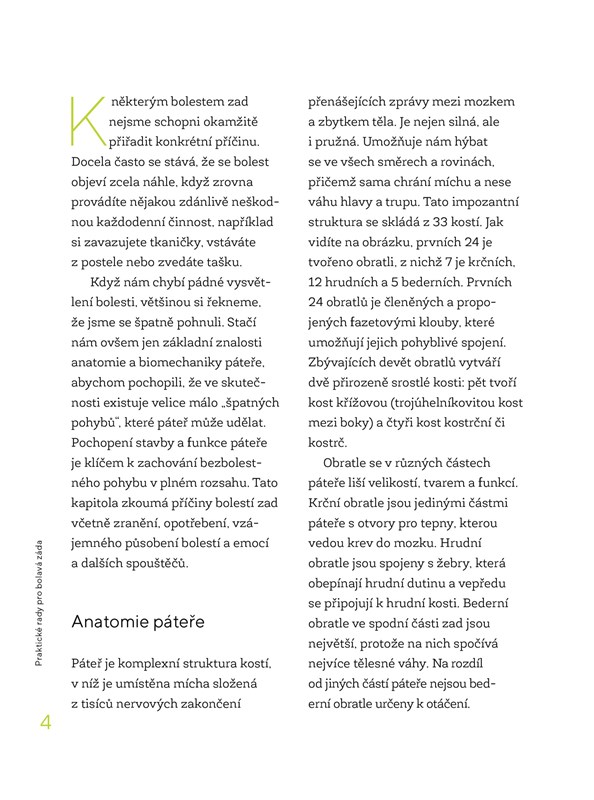 Cviky jsou rozděleny do tří celků a doplněny o dechová cvičení a aktivity k propojení těla a mysli. Navíc zde naleznete také tipy, jak se bolestí zad vyvarovat při cestování či dlouhém sezení, i alternativy k léčbě analgetiky či invazivními metodami.