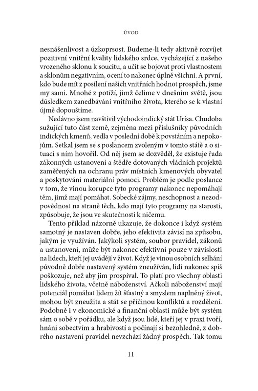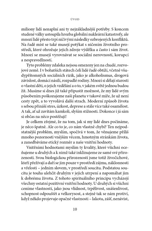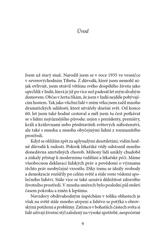Jeden z nejvýznamnějších myslitelů současnosti, tibetský duchovní vůdce dalajlama, předkládá v této knize výsledek svých celoživotních úvah o člověku, jeho životní cestě a hodnotách, které mu mohou pomáhat. Ačkoli čerpá ze zdrojů vlastní náboženské tradice (buddhismu), jeho pojetí etiky překračuje hranice náboženství a je univerzálně srozumitelné a přijatelné. Základními kameny jeho etického systému je soucítění, které je vlastní všem lidským bytostem právě proto, že jsou lidmi, ale také kritické myšlení a spravedlnost. Kniha se věnuje jak akutním problémům dnešního světa, tak i zcela konkrétním způsobům, jak dosáhnout klidu mysli a jak v sobě pěstovat schopnost soucítění a skutečnou lidskost, a to díky rozvíjení etické vnímavosti v každodenním životě, která dělá život snesitelnějším, hlubším a bohatším.