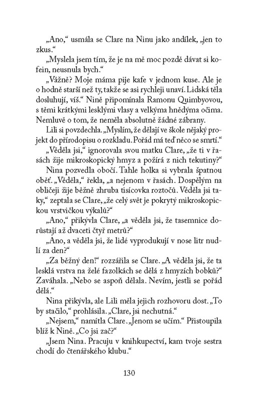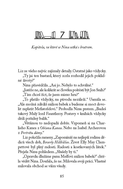A aby toho nebylo málo, do života věčné knihomolky zasáhne početné příbuzenstvo, o němž neměla celý život tušení. Závět po otci, kterého nikdy nepoznala, ale mluví jasně. Nina se stane členkou bizarní rodinky, v níž se věčně někdo s někým dohaduje. Aby to všechno přežila, musí se kromě čtení a snění naučit i milovat. Zběsilá jízda od autorky románu Drbny z předměstí vypráví o tom, že ten nejneuvěřitelnější příběh se neodehrává na stránkách knih, ale ve skutečnosti.