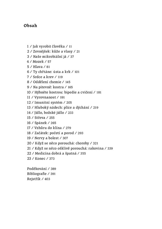 Podobných informací je v této fascinující, komplexní, čtenářsky přístupné a důvtipně napsané knize spousta. Vydejte se tedy s autorem na cestu do hlubin lidského organismu a zjistěte, jak funguje, co se v něm může porouchat a jak obdivuhodně se dokáže uzdravit. Díky jeho vyprávění si uvědomíte, že jsme mnohem složitější a záhadnější, než jste si dokázali představit.