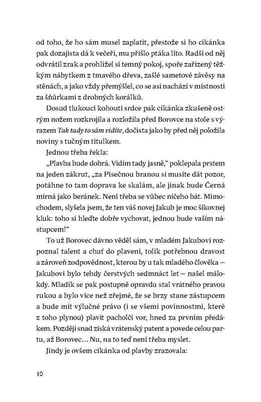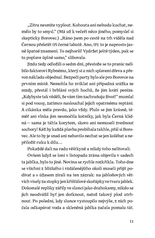 V nové knize Nory Eckhardtové se noříme do dvou příběhových linií. V blíže neurčené minulosti se odehrává tragický příběh voraře Jakuba a jeho snoubenky Loty, v současnosti se setkáváme s mladíkem Adamem, pátrajícím po ztraceném otci, a jeho přítelkyní Juditou. Mezi oběma příběhy protéká řeka Černá. Poklidně i prudce. V jednu chvíli hrdiny jemně kolébá, aby je vzápětí strhla do svých temných hlubin.