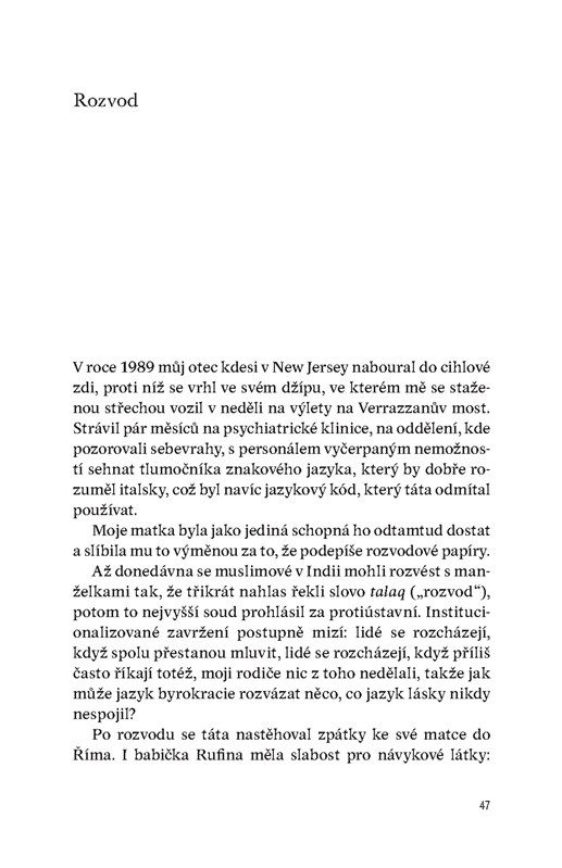 Román s autobiografickými prvky z pera současné italské autorky skládá z útržků vzpomínek, úvah a reálných i smyšlených historek barvitou historii rodiny rozkročené mezi velkolepý Řím, italskou čtvrť v Brooklynu, malebného, ale zapadlého italského městečka Basilicata a pobrexitový Londýn.