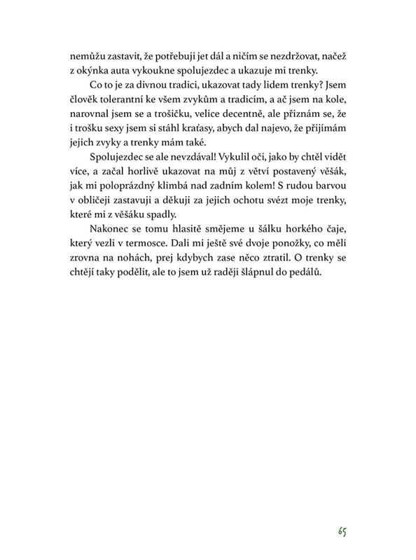 Tomík je opět na cestách. I když na kole nikdy předtím neujel víc než 50 kilometrů, rozhodl se absolvovat náročnou, 7 500 kilometrů dlouhou cestu. S padesátieurovkou v kapse, přiblblým výrazem ve tváři a nadšením v duši projel osm zemí. Potýkal se s rozpáleným Tureckem, užíval si pohostinnou Gruzii, provrávoral vodkou nasáklým Ruskem a dostal se i do ponurého Černobylu. A o tom všem vypráví s neodolatelným humorem, který vám zaručeně zvedne náladu.