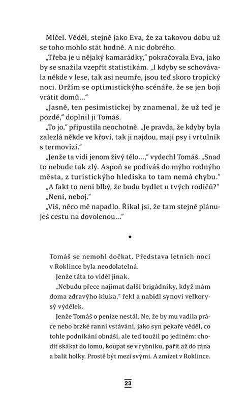Tomáš Volf se opět setkává s Evou Černou, kterou přivede pátrání po pohřešované Elišce do jeho rodiště. Dívka způsobila tragédii, utekla a vše nasvědčuje tomu, že si chce ublížit. Vyšetřování však otevírá staré rány místních obyvatel. Tomáš se vrací k létu, které chtěl navždy vytěsnit z paměti. Jenže právě jeho vzpomínky mohou být jedinou šancí k nalezení zmizelé. Čas neúprosně běží a současnost až nepříjemně připomíná patnáct let staré události.
