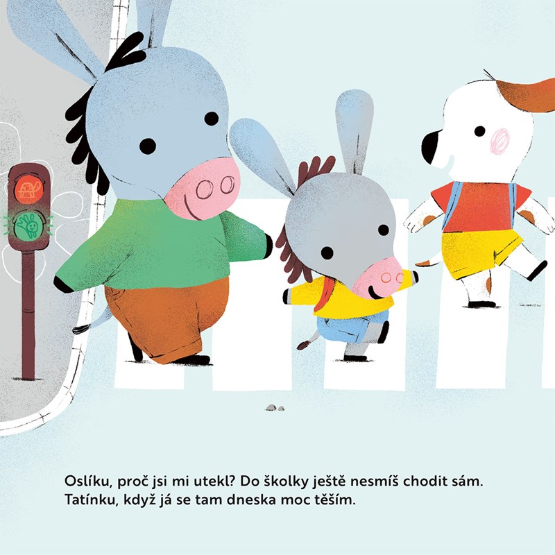 I na takové obyčejné cestě do školky se může skrývat spousta nástrah, zvlášť když si oslík usmyslí, že už je dost velký, a proto nepotřebuje tatínkův doprovod. Dneska navíc oslík velmi spěchá, protože hrají s kamarády ve školce divadlo. Kouzelná zvuková tlačítka a krásné ilustrace tě provedou oslíkovou cestou.