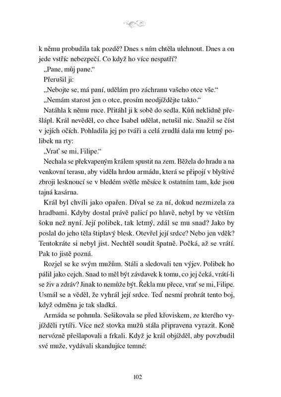 Isabel se stává ženou sebevědomého a pyšného krále Filipa, který své zemi vládne tvrdě, ale spravedlivě. Mladá dívka je do svatby nucena otcem přesto, že miluje jiného. Po odhalení její údajné zrady ji má stihnout krutý trest. Tomu naštěstí zabrání její přítelkyně, věrná a obětavá služebná Sára. Král díky ní své ženě odpustí a začne chápat, čím pro ni je. Cizím a krutým hromotlukem. Pomalu otevírá oči a přijímá výzvu, jež mu nabízí nečekané a pro něj neznámé obzory. Nejdříve snad ze zvědavosti a touhy uspět, později však najde hlubší cíl. Získat srdce své paní. Isabel se však cítí být v pasti. Podaří se mu přemoci její strach a možná i nenávist? Do všeho navíc zasáhne náhlé přepadení tvrze jejího otce. Mnohá další dobrodružství, bitvy a úskalí odhalí pravou tvář lásky nejen králi.
