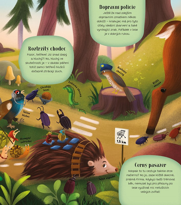V lese to je samý spěch a shon, skoro jako by se zvířátka naučila pospíchat od lidí. Dokážete si představit, že by to v lese fungovalo stejně jako ve městě? Vůdce organizované vlčí smečky hravě zvládne funkci starosty, jeleni tvoří místní smetánku a havran dokáže takové divy, že připomíná pouliční komedianty. Funguje tu holubí pošta a o noční život také není nouze. Nahlédněte do lesního města a dozvíte se spoustu novinek o jeho obyvatelích i důležité informace o každé městské čtvrti. A kdybyste se náhodou ztratili, žádný strach – kniha obsahuje i přehlednou mapu!