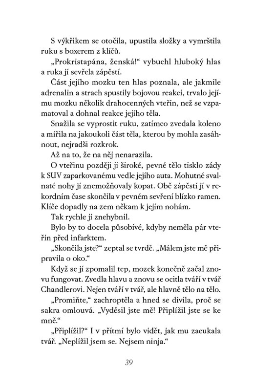 Finále trilogie o sexy bratrech Gambleových nabírá grády. Chandler má z celé rodiny největší zkušenosti. A taky si potrpí na pikantní záležitosti, které nejradši realizuje v erotickém klubu Kůže a krajka. Urostlý bodyguard nemá o obdivovatelky nouzi, ale nejvíce ho překvapivě zaujme odměřená Alana, která je specialistkou na styk s veřejností, ale v soukromí si moc povyražení neužije. Chandler má příležitost nejen ji chránit před stalkerem, který jí vyhrožuje anonymními dopisy, ale dostat ji do postele. A Alana moc dobře ví, že taková životní šance se neodmítá. Testosteronový bůh Chandler Gamble totiž stojí za nejeden hřích…