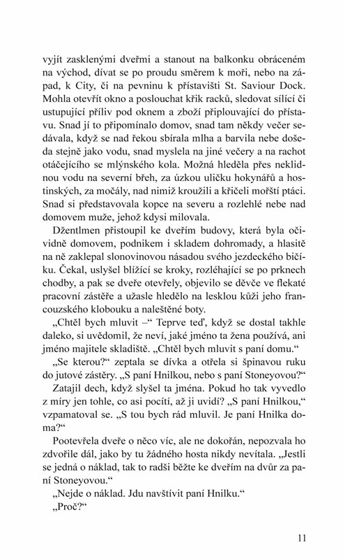 Do zchátralého londýnského skladiště na jižním břehu Temže dorazí dva nečekaní návštěvníci. První z nich je bohatý muž z Yorkshiru, pátrající po milence, již před jednadvaceti lety opustil. James Avery má dnes vše: peníze, pozemky, ba i královu přízeň. Chybí mu jen jedno, a o to teď žádá Alinor, majitelku nuzného skladiště – o dítě, které s ní kdysi zplodil.