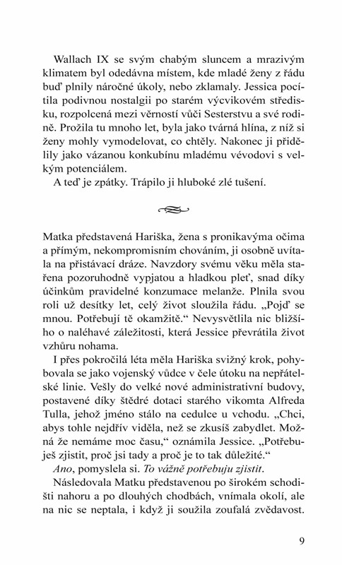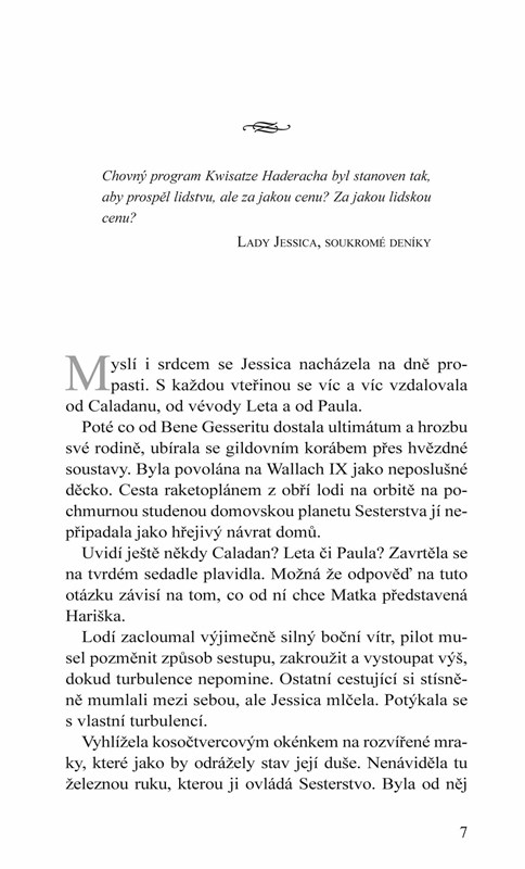 Lady Jessica, matka mladého Paula a konkubína vévody Leta, byla až donedávna pilířem rodiny Atreidů. Volba, jíž se před lety dopustila, se brzy podepíše na vývoji celého Impéria, prozatím se však lady z Caladanu musí vypořádat se svým vztahem k Bene Gesseritu. Už jednou se k němu obrátila zády a nyní se musí rozhodnout, zda její věrnost k prastarému řádu převáží nad láskou k Letu Atreidovi a synu Paulovi. Události na Wallachu IX a v celém Impériu se odvíjejí tak bouřlivě, že nad nimi ztrácí kontrolu dokonce i samotné Sesterstvo. Osudy lady Jessiky a její rodiny visí na vlásku…