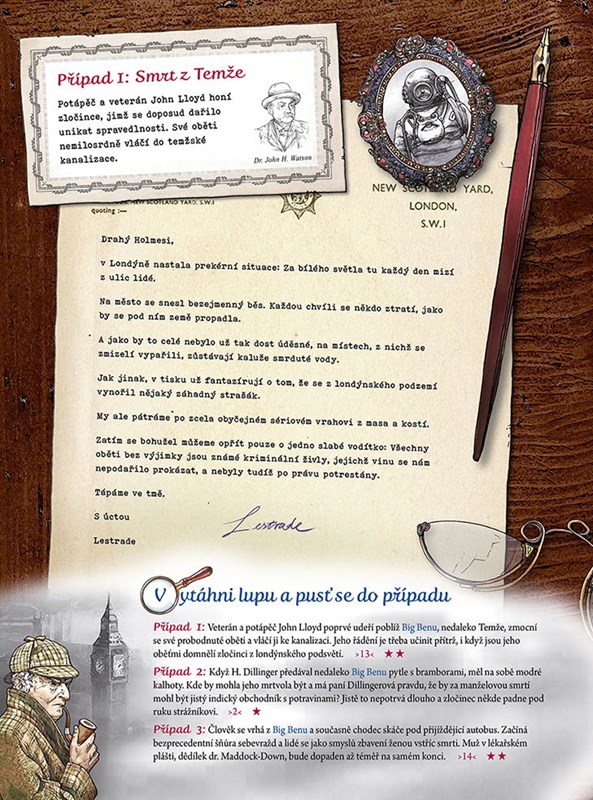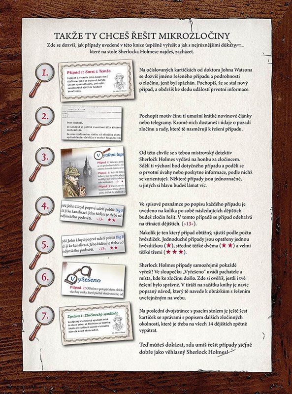 Teď jste na řadě vy! Vezměte lupu do ruky a pomozte Sherlockovi řešit ty nejzákeřnější zločiny páchané na nebohých Londýňanech. Na každé ilustrované straně na vás čekají klíčové stopy, hrozivá místa činu a utajení svědkové. Dokážete je vypátrat všechny? Tyto obrázkové hádanky jsou určeny pro opravdové detektivy!